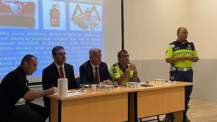 İlçe Jandarma Trafik Komutanlığı ve Bölge Trafik Denetleme ekipleri tarafından sürücülere yönelik trafik güvenliği, hız kontrolü, emniyet kemeri kullanımı, okul servis araçlarının taşıma standartları gibi konularda sunumlar yapılarak dikkat edilmesi gereken hususlar aktarıldı.