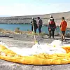 İlçeyi gezmeye gelen 40 kişiden oluşan kafile üyeleri, önce Göktepe mevkiinde yamaç paraşütü uçuşu yaptı, ardından gölde yüzdü.