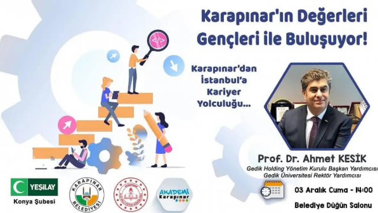 Karapınar ilçesinde, ‘Karapınar'ın Değerleri Gençlerimiz ile Buluşuyor’ etkinliği düzenlenecek. Etkinlik ile ilgili yapılan açıklamada, “Yeşilay Konya Şubesi, Karapınar Belediyesi ve Karapınar İlçe Milli Eğitim Müdürlüğü iş birliği ile ‘Karapınar'ın Değerleri Gençlerimiz ile Buluşuyor’ etkinlikleri kapsamında ilçedeki lise öğrencilerini Prof. Dr. Ahmet Kesik ile buluşturuyoruz. Emeği geçen herkese teşekkür ederiz. Öğrencilerimiz için düzenlenen etkinliklerimiz devam edecek” denildi.