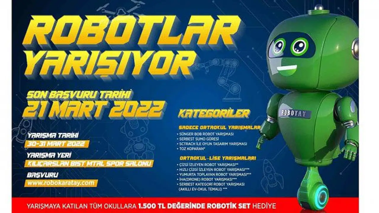 Karatay Belediyesi, Mevlana Kalkınma Ajansı ve Karatay İlçe Milli Eğitim Müdürlüğü işbirliğiyle düzenlenen "Robokaratay Robot Yarışması" 30-31 Mart 2022 tarihinde Kılıçarslan İMKB Mesleki ve Teknik Anadolu Lisesi'nde yapılacak. Yarışmanın ön başvuruları ise 21 Mart 2022 Pazartesi günü sona erecek. Ön başvurular www.robokaratay.com adresinden kabul edilmeye başlandı.