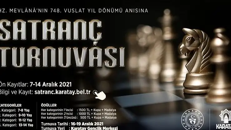 Karatay Belediyesi, Konya Gençlik ve Spor İl Müdürlüğü işbirliğiyle Hz. Mevlâna'nın 748. Vuslat Yıldönümü anısına Satranç Turnuvası düzenliyor. 7-14 yaş aralığındaki sporcuların katılabileceği turnuvanın başvuruları 14 Aralık’a kadar kabul edilecek. İlk tur 17 Aralık’ta turnuvanın finali ve ödül töreni ise 19 Aralık Pazar günü gerçekleştirilecek.