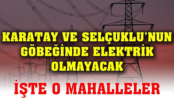 Konya’da yarın (3 Kasım) bakım çalışmaları nedeniyle Karatay ve Selçuklu ilçelerinin belirtilen mahallelerinde elektrik kesintisi yaşanacak. Vatandaşlar mağdur olmamaları adına uyarıldı. İşte elektrik kesintisi yaşanacak mahalleler;