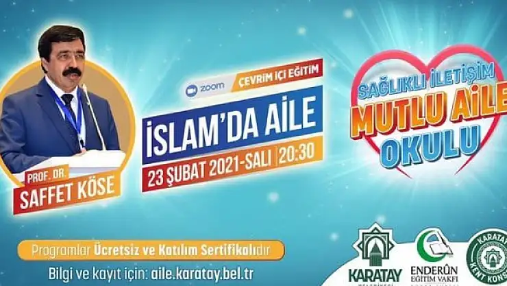 Karatay Belediyesi, Enderun Eğitim Vakfı ve Karatay Kent Konseyi işbirliğiyle gerçekleştirilen “Sağlıklı İletişim Mutlu Aile Okulu” seminerleri devam ediyor. Bu kapsamda Prof. Dr. Saffet Köse, bugün dijital ortamda “İslam’da Aile” konu başlığında bir seminer verecek. Karatay Belediyesi, Enderun Eğitim Vakfı Konya Şubesi ve Karatay Kent Konseyi işbirliği ile hazırlanan “Sağlıklı İletişim Mutlu Aile Okulu” seminerleri devam ediyor. Aile kurumunun korunması, ailenin bir bütünlük içerisinde ve sağlıklı bir şekilde devamlılığının sağlanması ve daha birçok konunun ele alındığı seminerler dizisi, bu yıl pandemi nedeniyle dijital platformlardan gerçekleştiriliyor.