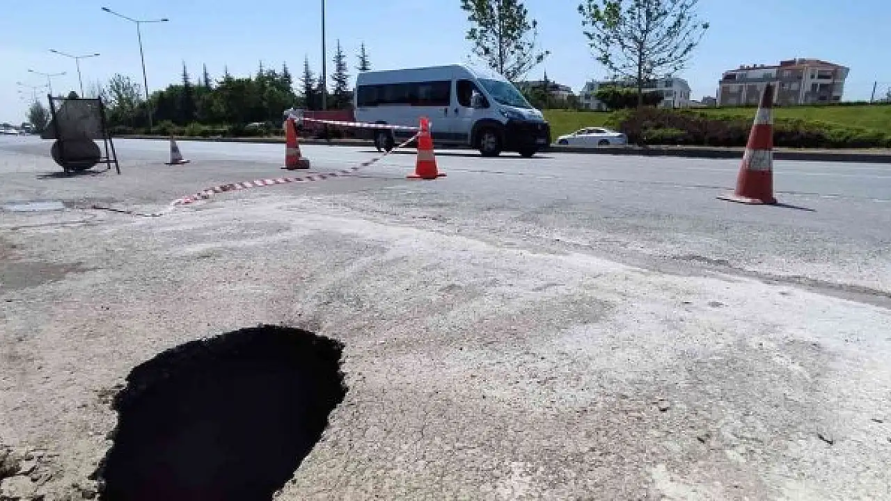 Eskişehir'de kara yolunun kenarında oluşan yaklaşık 2 buçuk metre derinliğindeki dev çukur, görenleri hayrete düşürdü.