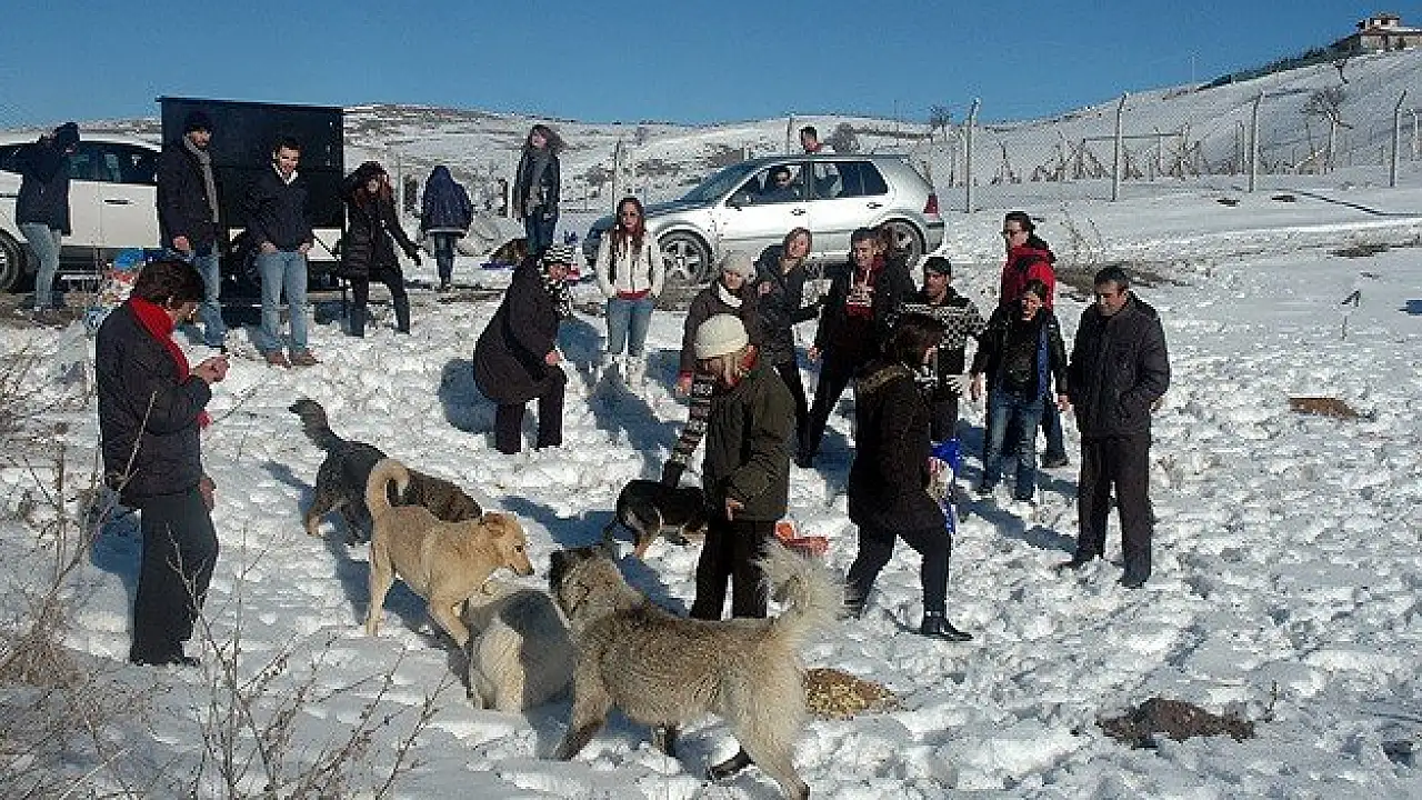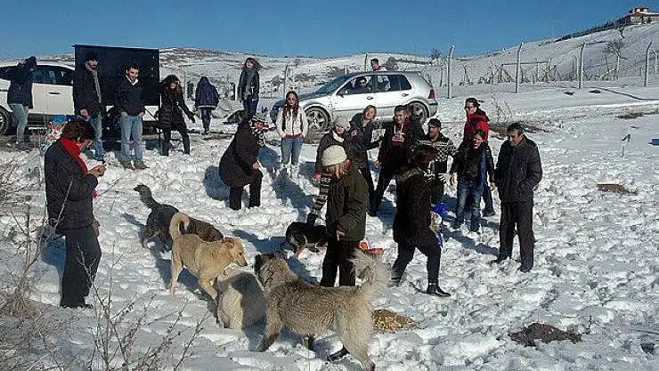 Ankara'da bir grup hayvansever, Elmadağ Kayak Merkezi civarında kar nedeniyle yiyecek bulmakta zorlanan sokak köpeklerini besledi.