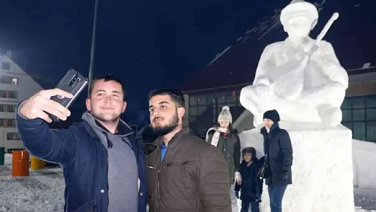 Sivas'ta Aşık Veysel Şatıroğlu'nun kardan yapılan heykeli ilgi gördü, kardan heykelle fotoğraf çektirmek isteyenler önünde sıraya girdi.