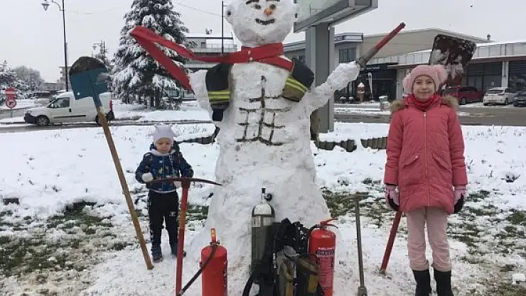 İnegöl'de 24 boyunca görevde olan itfaiye ekipleri, yağan karın ardından İtfaiye Müdürlüğü önüne kardan itfaiye eri yaptılar. İtfaiye eri giysisi ve kaskı takılan kardan adamı gören vatandaşlar, fotoğraf çektirerek anı ölümsüzleştirdiler.