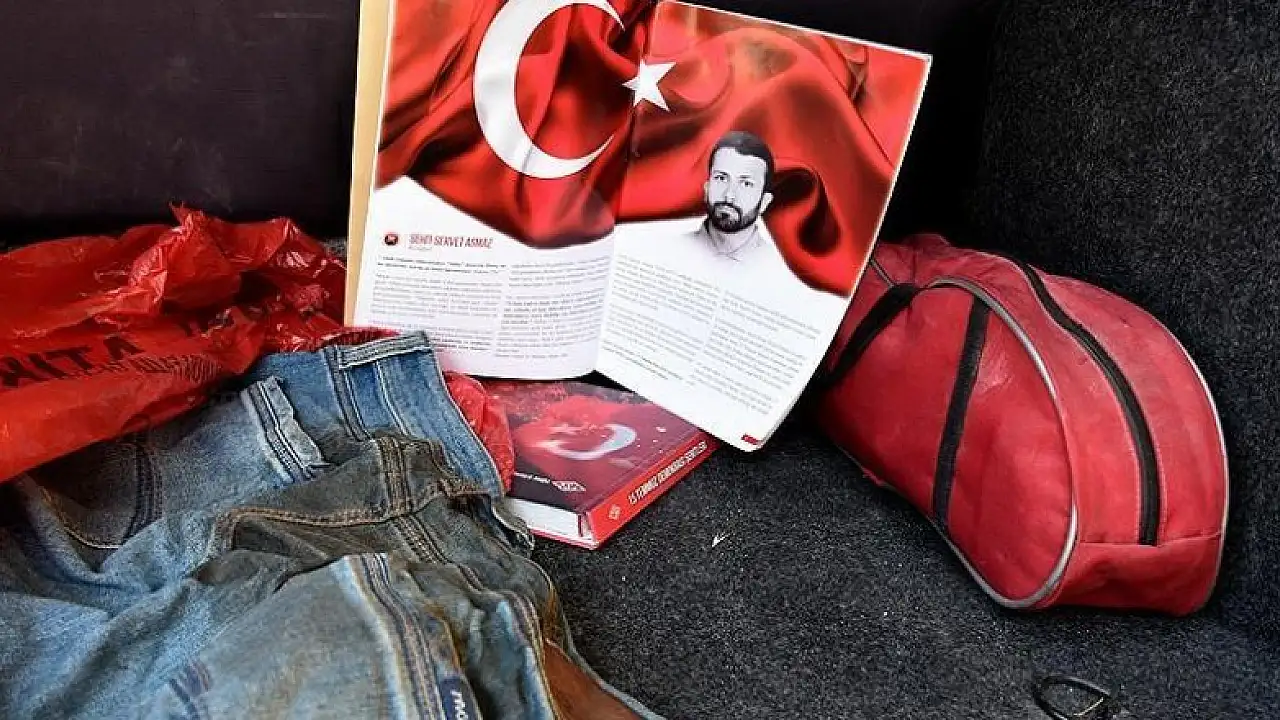 15 Temmuz günü darbecilerin açtığı ateş sonucu yaralanan ve kaldırıldığı hastanede şehit olan Gümüşhaneli Servet Asmaz'ın ağabeyi, kardeşinin yaşamını yitirdiği gün üzerinde olan kıyafetlerini arabasında taşıyor.