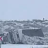 Karlı yolda devrilen tır, yolu trafiğe kapattı