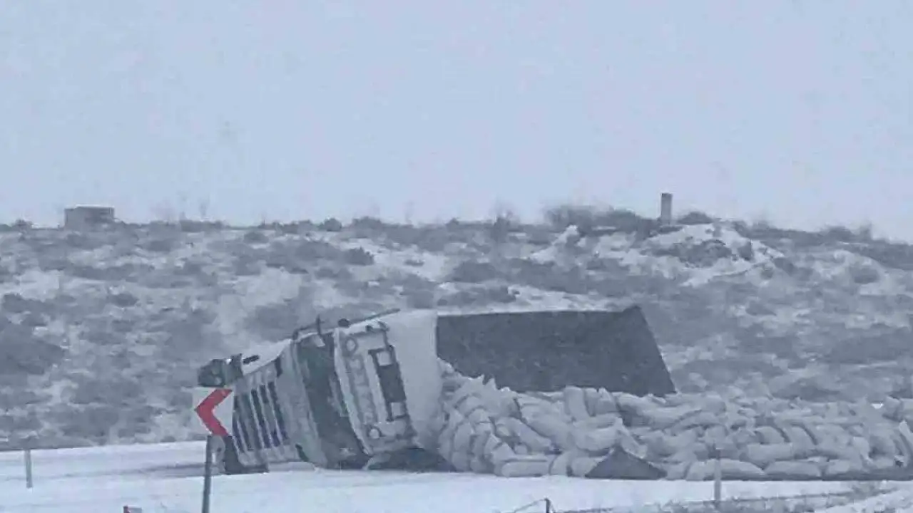 Malatya-Sivas karayolunda kar nedeniyle kayganlaşan yolda devrilen tır yolu trafiğe kapatırken, kazada yaralanan olmadı.