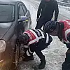 Karlı yolda kalan araçları jandarma ekipleri kurtardı