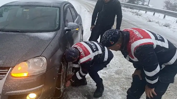 Jandarma ekipleri, yolda kalan araçların zincir takıp şarampole kayan araçları ise çekerek kurtardı. Ekipler, sürücüleri kar yağışına karşı tedbirli olmaları konusunda uyardı.