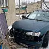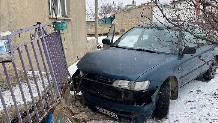 Afyonkarahisar'ın Bolvadin ilçesinde kar yağışından dolayı kayarak kontrolden çıkan bir otomobil yol kenarındaki evin balkonuna çarparak durabildi.