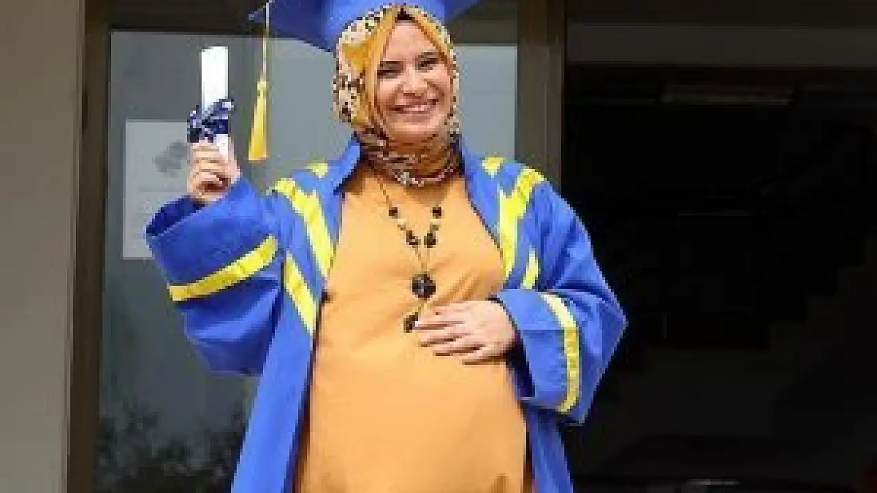 Mersin'de, başörtüsü sorununun çözülmesinin ardından üniversiteye gidebilen 8 aylık hamile Sevim Esra Gültekin, mezuniyet sevinci yaşıyor.