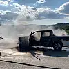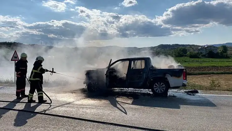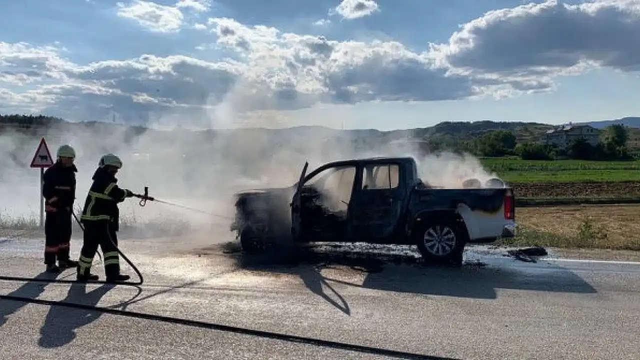 KASTAMONU Taşköprü'de seyir halindeki askeri pikap alev aldı. Yanan pikapta bulunan 2 askeri personel olaydan yara almadan kurtuldu.