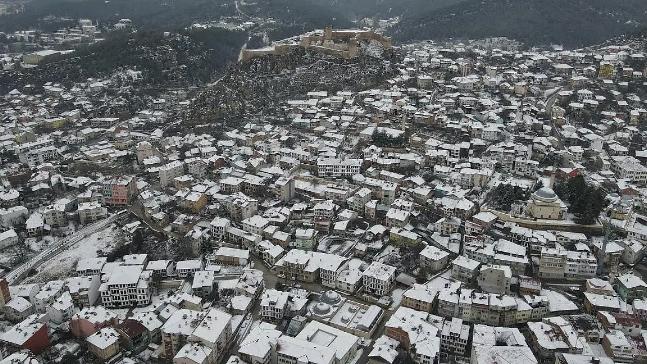 Kastamonu'da kar yağışının ardından beyaza bürünen kent merkezi dron ile görüntülendi.