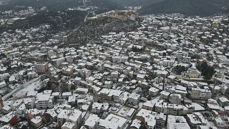 Kar yağışıyla beyaza bürünün kent merkezi dron ile görüntülendi.
