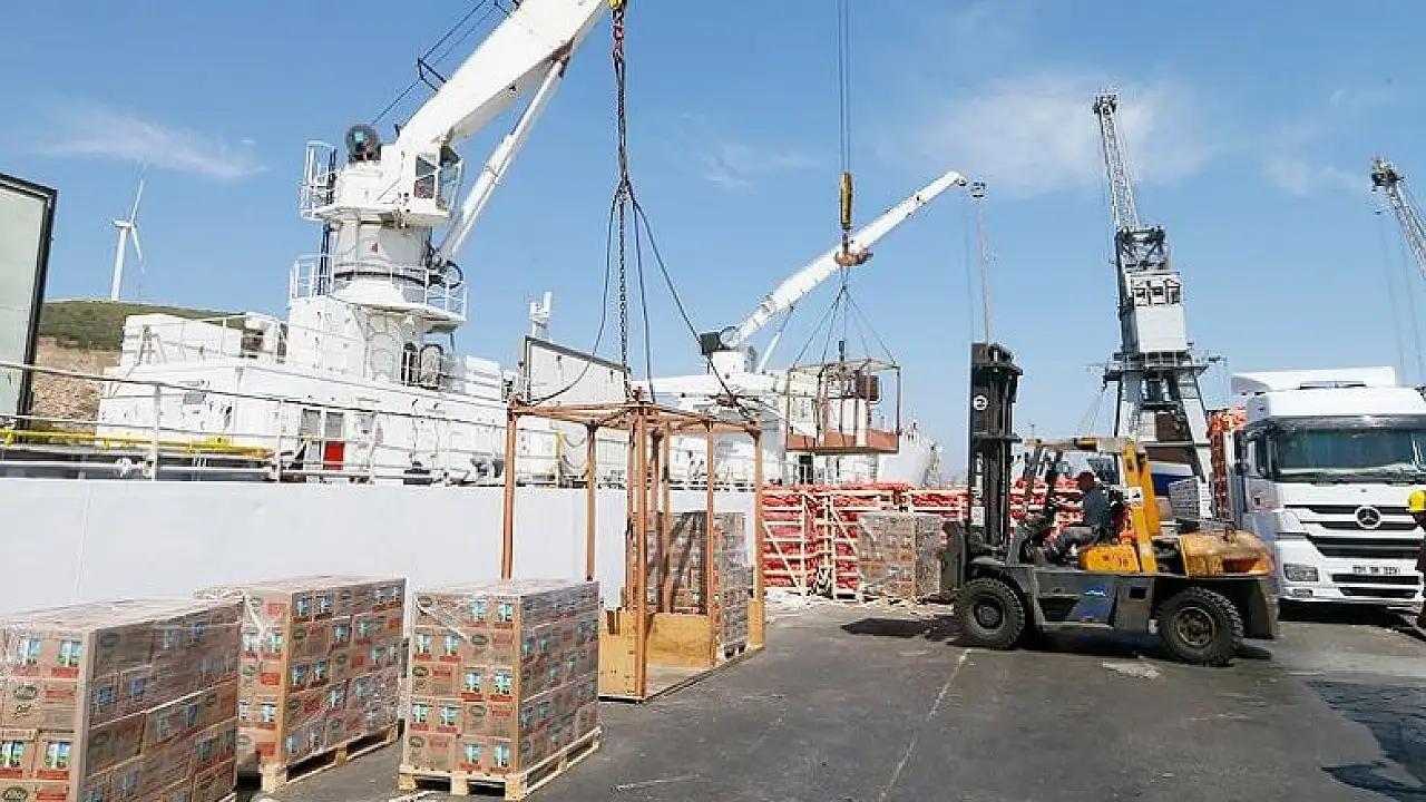 Aliağa ilçesinde bulunan bir limandan yüklenen kuru gıda, meyve ve sebzelerden oluşan malzemeler yüklü gemi sabaha doğru yola çıktı.