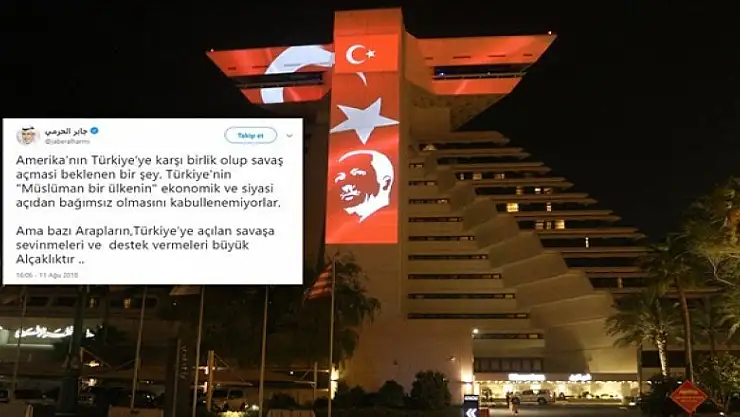 Katarlı yazar ve ünlü medya yöneticisi Jaber El-Harmi, ABD'nin Türkiye'ye yönelik ekonomik savaşıyla ilgili değerlendirmelerde bulundu. Harmi, Türkçe tweet atarak Türkiye'ye destek oldu.