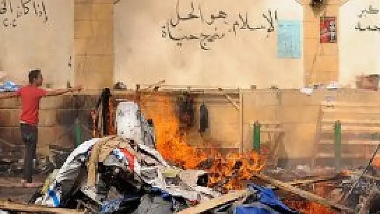 Kahire'nin güneyindeki Rabiatul Adeviyye Meydanı'nda ekipler, iş makineleri ve kamyonlar eşliğinde 47 gün süren kitlesel oturma eyleminden geriye kalanları temizlemeye başladı. Meydanla aynı ismi taşıyan ve yaşanan katliam sonrasında morga çevrilen Rabia camisindeyse yangının izleri görülüyor.