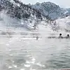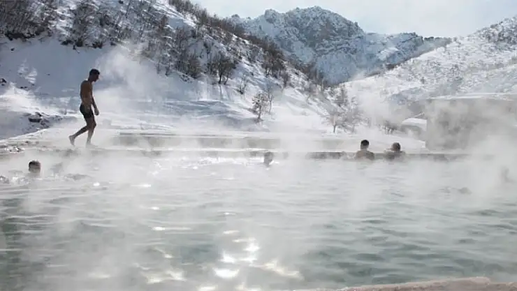 Hava sıcaklığının eksi 15 dereceyi bulduğu Şırnak'ın Beytüşşebap ilçesindeki Kato Dağı eteklerinde bulunan Zümrüt Kaplıcası ziyaretçi akınına uğruyor.