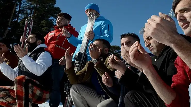 Bütün hazırlıklar tamamlanmasına rağmen kar yağmadığı için sezonu açamayan otel çalışanları ve kayak hocaları, birinci etap piste çıkarak "kar duası" etti.