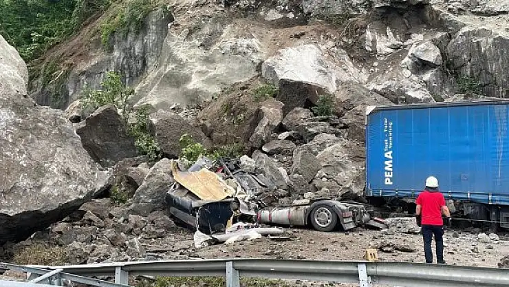 Artvin'in Hopa ilçesi Karadeniz Sahil Yolu Esenkıyı tüneli mevkisinde meydana gelen heyelanda dev kayaların altında kalan TIR'ın şoförü yaşamını yitirdi.
