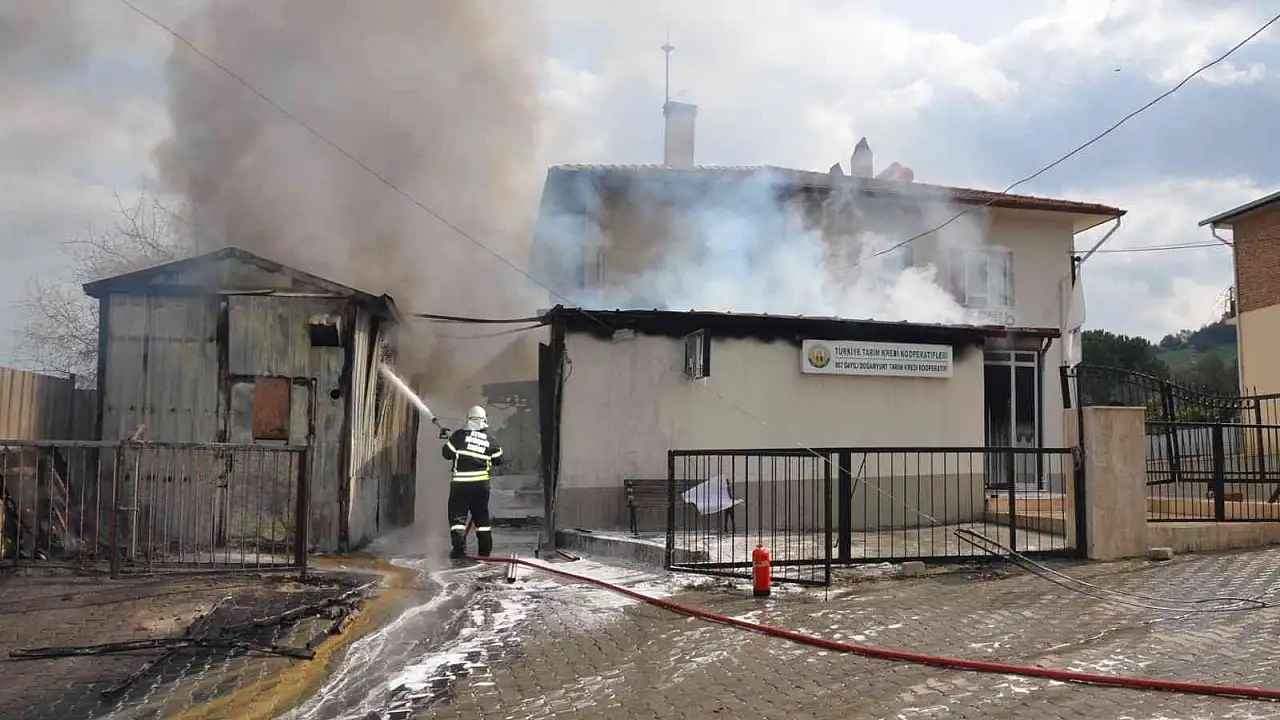 Aydın'ın Çine ilçesinde, Doğanyurt Tarım Kredi Kooperatifi'nde kaynak sırasında çıkan kıvılcımın mazot deposunu tutuşturması sonucu yangın çıktı.