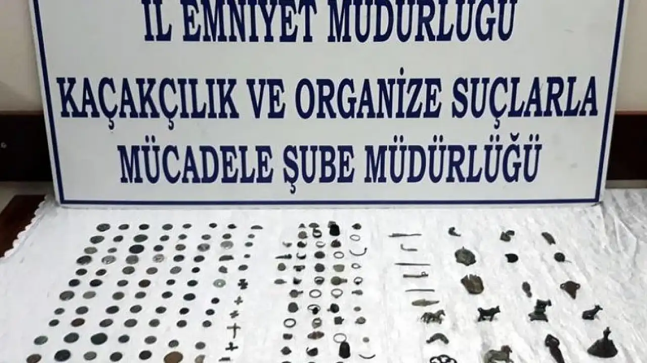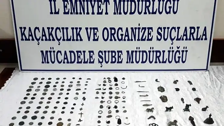 İş yerinde yapılan aramada, çeşitli dönemlere ait 85 sikke, 5 haç, 4 yüzük, 5 ok ucu, 22 hayvan figürü ve değişik ebatlarda objeler olmak üzere 165 parça tarihi eser ele geçirildi.