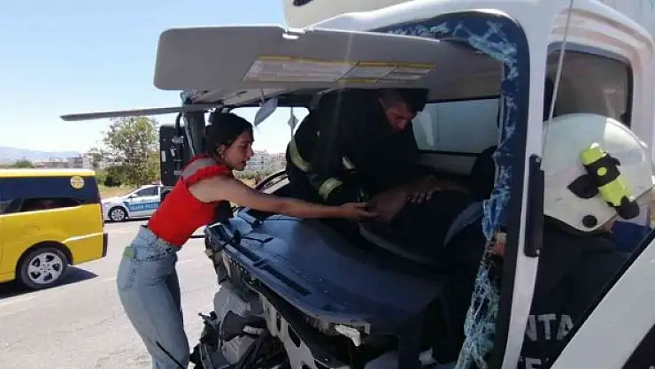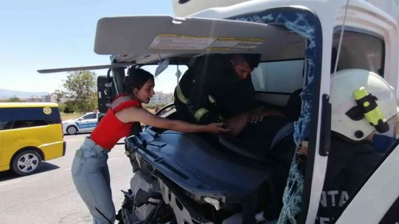 Manavgat'ta 2 kamyonun çarpışması sonucu meydana gelen trafik kazasında kamyonda sıkışan, yaralı sürücü kurtarma ekipleri tarafından çıkarıldı. Düğün konvoyları nedeniyle tıkanan yolda ambulans olay yerine ulaşmakta gecikirken, yoldan geçerken kazayı gören ve Acil Tıp Teknisyeni olduğu belirlenen genç bir kız, yaralının başından bir an bile ayrılmadan hem ekiplere hem yaralıya destek verdi.