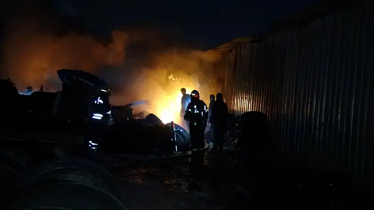 Kereste fabrikasının yanındaki atık lastikler yandı
