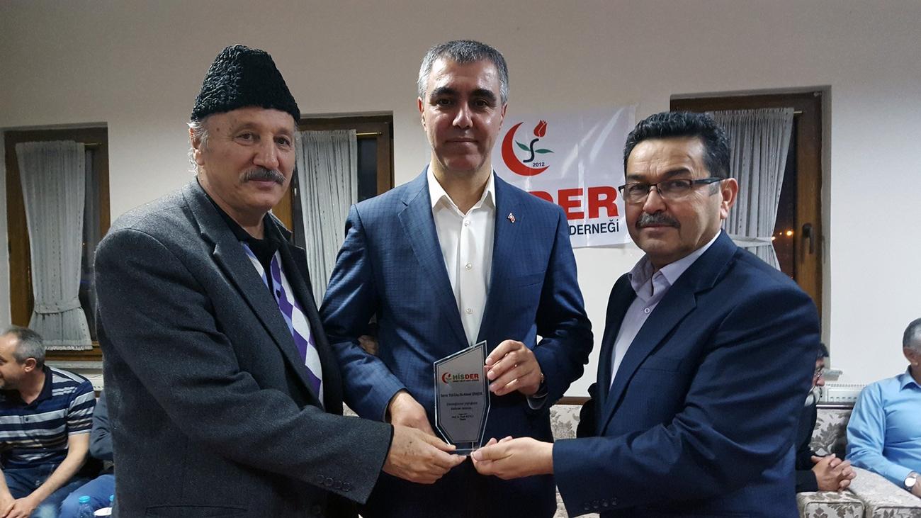 Soru-cevap kısmından sonra Türk Dünyası Uzmanı Yrd. Doç. Dr. Ahmet Şimşek’e HİSDER’in teşekkür plaketini derneğin başkan yardımcısı Mustafa Dündar ve Muammer Yavuz’la birlikte verdiler.