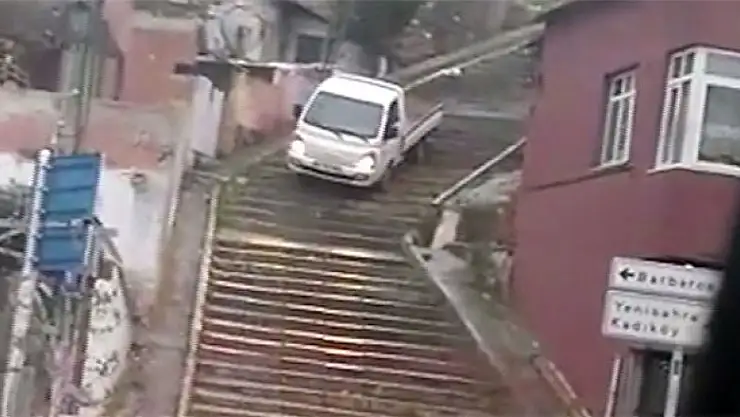 Akıllara durgunluk veren olay İstanbul Kadıköy’de meydana geldi. Gideceği yöne kestirmeden gitmeye çalışan bir kamyonet sürücüsü, yolu kullanmak yerine yayalar için yapılan merdiveni kullandı. Kemal Sunal filmlerini anımsatan olayda sürücünün kamyoneti ile merdivenlerden ağır ağır inişi cep telefonu kameralarına yansıdı. Görüntüler de kamyonetin ağır ağır merdivenlerden indiği görülüyor. Bu sırada okuldan çıkan iki çocuğun da merdivenlerden yayan olarak çıkmaya çalıştığı görülüyor.
