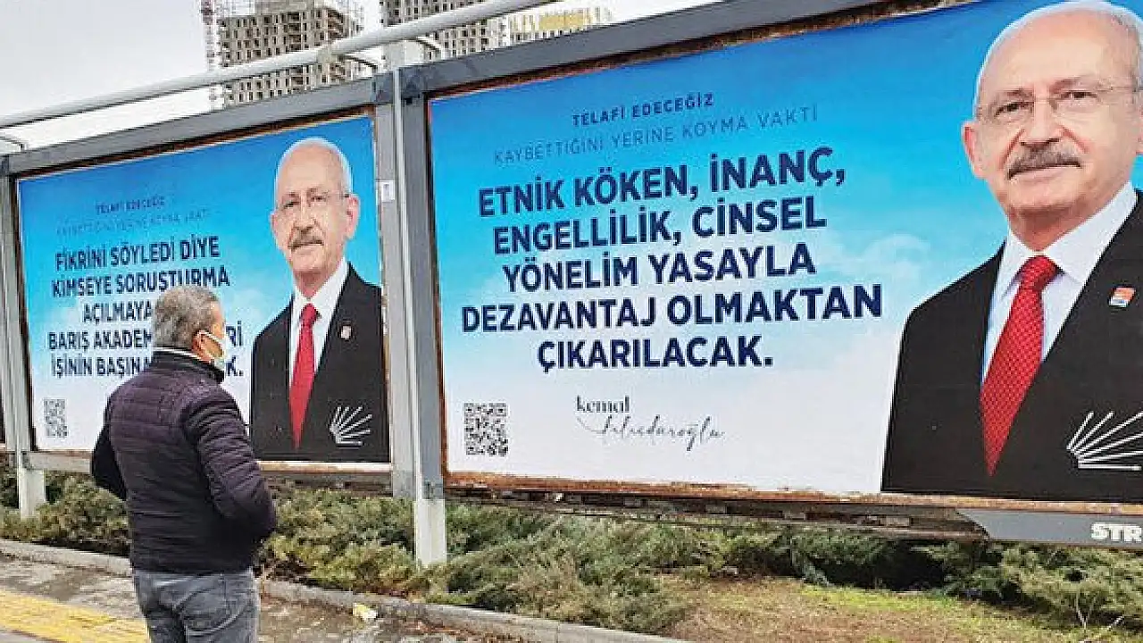 İstanbul, İzmir ve Ankara’nın değişik noktalarına ‘cinsel yönelim yasayla dezavantaj olmaktan çıkarılacak’ yazılı afişler astırarak eşcinseller için yasal düzenleme sözü verin CHP lideri Kemal Kılıçdaroğlu’nun aynı vaadi 11 Aralık 2021’de de dillendirdiği ortaya çıktı.
