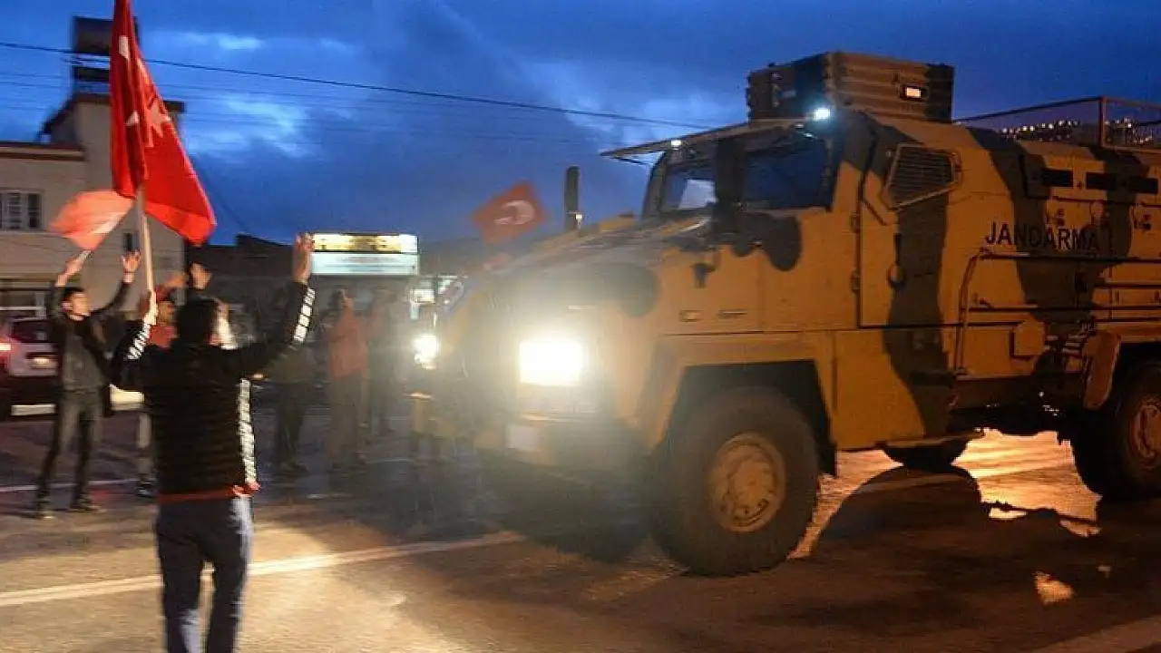 Bu esnada ellerinde Türk bayraklarıyla yola çıkan çok sayıda vatandaş, zırhlı araçların birinden çalınan marşlar eşliğinde güvenlik güçlerini uğurlamak üzere merkez önünde bir araya geldi. Vatandaşlar, askerlere sevgi gösterisinde bulundu.