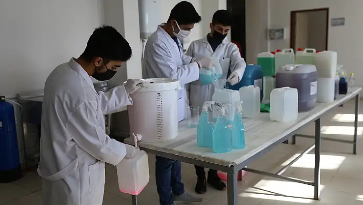 Okulun müdür yardımcısı Rıza Karabulut da öğrencilerin salgın sürecinde önemli çalışmalar yaptığını, temizlik malzemesi, kolonya, el ve cilt antiseptik dezenfektanı gibi ürünlerin illere, ilçelere, kamu kurum ve kuruluşlarına dağıtıldığını dile getirdi.
