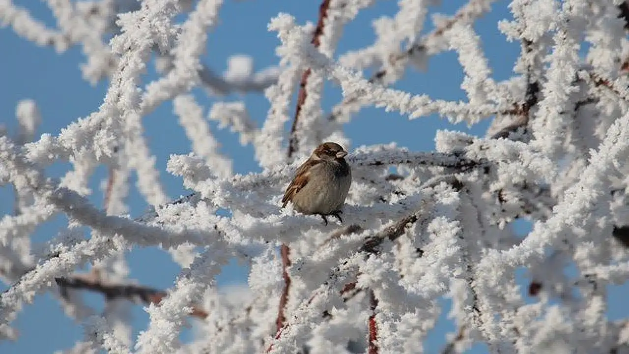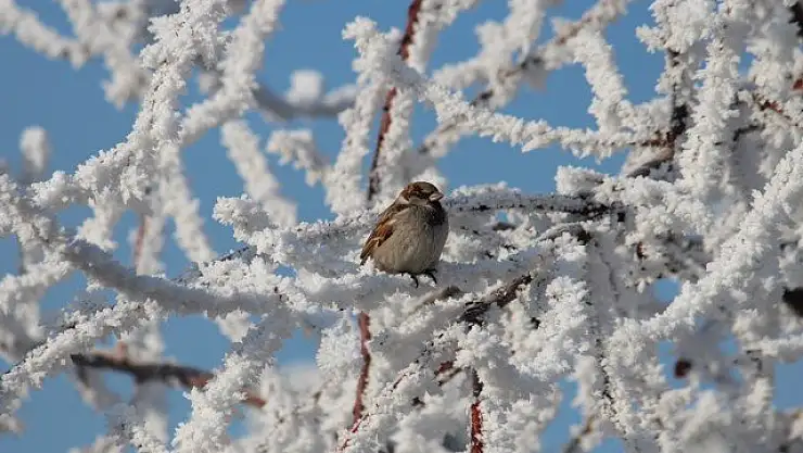 Göl kıyılarında ağaçlar üzerinde gezinerek daldan dala konan serçeler, Beyşehir'de sabah saatlerinde ağaçların dalları üzerine düşen kırağı ile birlikte güzel ve bembeyaz görüntüler oluşturuyor.