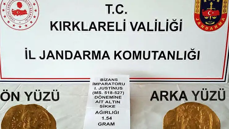 İl Jandarma Komutanlığı ekipleri, yaptıkları çalışmada Lüleburgaz ilçesinde A.D.'nin elinde tarihi eser bulunduğunu belirledi. A.D.'nin iş yerinde yapılan aramada Bizans İmparatorluğu 1'inci Justinus dönemine ait 1,54 gram ağırlığında altın sikke ele geçirildi.