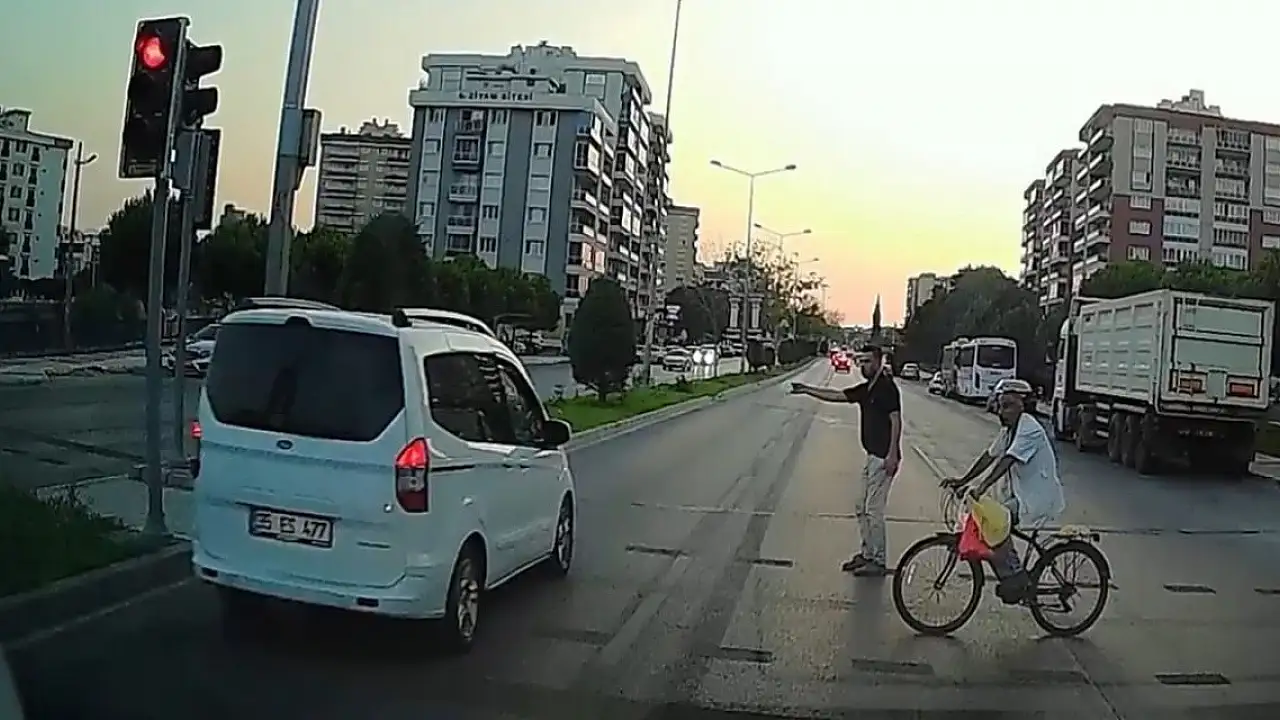 Olay dün akşam saat 20.00 sıralarında Yüzbaşı İbrahim Hakkı Caddesi'nde meydana geldi. 35 ES 477 plakalı hafif ticari araç, kırmızı ışık yandığı sırada süratli bir şekilde yoluna devam etti. Bu esnada yaya geçidinden yolun karşısına geçmek isteyen biri bisikletli 2 kişi, hızla gelen aracı son anda fark ederek altında kalmaktan kurtuldu.