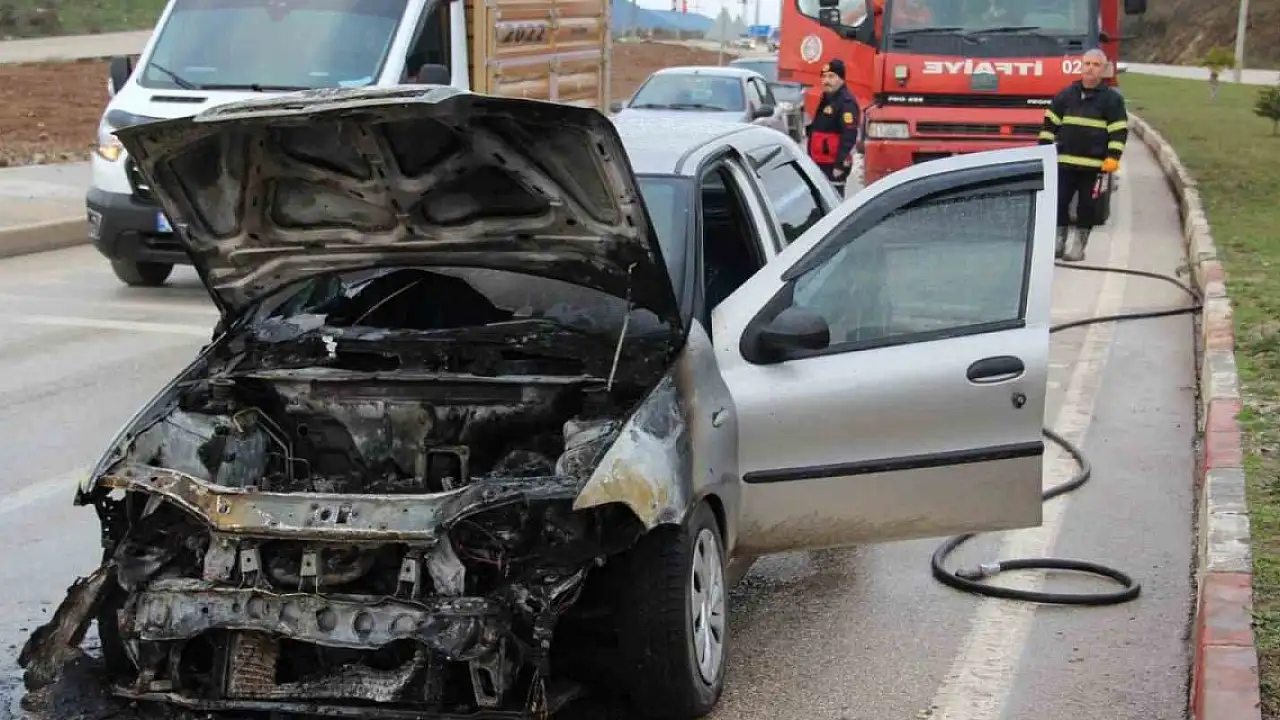 Çanakkale'nin Çan ilçesinde ışıklarda duramayan araç öndeki araçlara çarparak alev aldı.