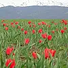 Bingöl ovasında doğal olarak yetişen ve endemik bitki türleri arasında yer alan kırmızı laleler, karlı dağlarla birlikte kartpostallık görüntüler oluşturuyor.