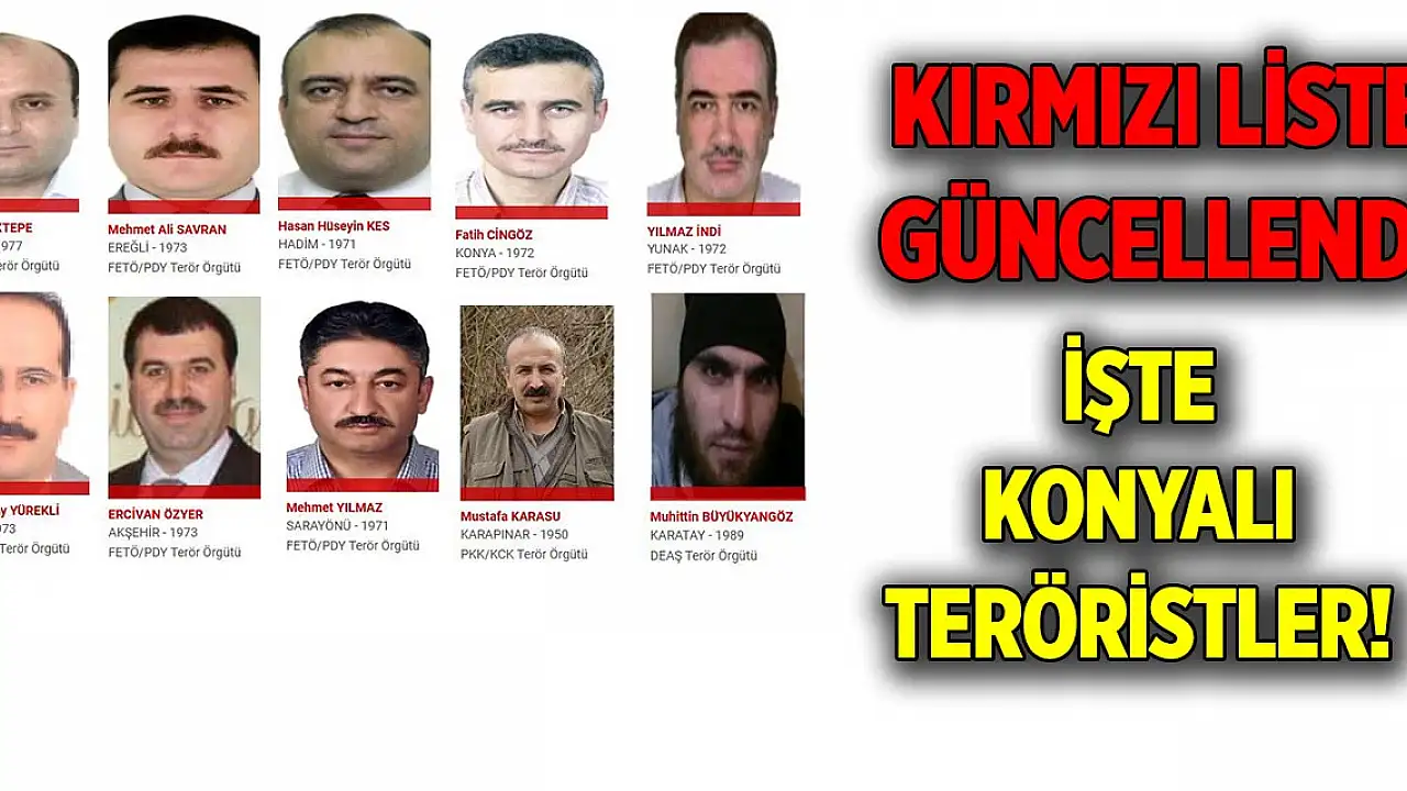 İçişleri Bakanlığı terör listesinde Konya kütüğüne kayıtlı teröristler belli oldu. Kırmızı Listede 10 terörist yer aldı. Bu teröristlerden 8’i FETÖ/PYD terör örgütü üyesi olarak kayıtlara geçti.