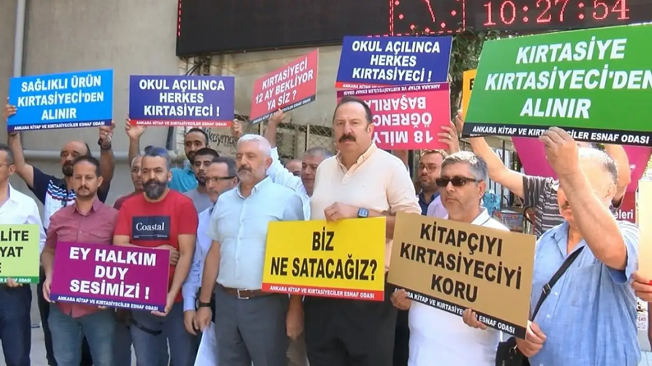 Ankara Kitap ve Kırtasiyeciler Esnaf Odası üyeleri, Altındağ ilçesinde kırtasiye önünde toplanarak basın açıklaması yaptı. Kırtasiyeci esnafı "Kırtasiye kırtasiyeciden alınır', "Okul açılınca herkes kırtasiyeci', "Biz ne satacağız" yazılı dövizlerle tepkilerini gösterdi. Oda Başkanı Müslüm Küçükarzuman, zincir marketlerde kırtasiye ürünü satılmasına karşı olduklarını söyleyerek, "Marketler satıyor, bakkal, manav, kasap herkes kırtasiye satıyor; fakat kırtasiyeciler kırtasiye satamıyor. Marketlerden kırtasiye ve kırtasiye ürünlerini çıkaralım. Çünkü bizi oldukça zorluyorlar. Biz zaten küçük esnafız. Sigortamızı yatıramıyoruz. Borçlarımızı ödeyemiyoruz. Ankara'da Ankara Kitap ve Kırtasiyeciler Esnaf Odası olarak, 2 bin üyeye sahibiz. Toplam 4 bine yakın kırtasiyeciyiz biz, dükkan sayısı olarak. Ankara'nın yüzde 20'si bu işten ekmek yiyor; ama gel görelim bizim dışımızda herkes kırtasiye satıyor. Buna bir çare bulunmasını istiyoruz" dedi.Okullarda ticaret yapıldığını savunan Küçükarzuman, "Özel okullar zaten kırtasiyeciden mal almıyor. Neden? Çünkü orada stant açtırıyor, anlaşıyor. Para karşılığında birilerine sattırıyor. Ama bunların hiçbiri kitapçı, kırtasiyeci değil. Gider kalemlerimiz çok yükseldi, kiralar aldı başını gitti. Balık zamanı herkes, bütün esnaflar, Türkiye'deki bütün esnaflar balık mı satar? Balık tezgahında kırtasiye satıyorlar. Böyle bir şey olur mu?" ifadelerini kullandı.