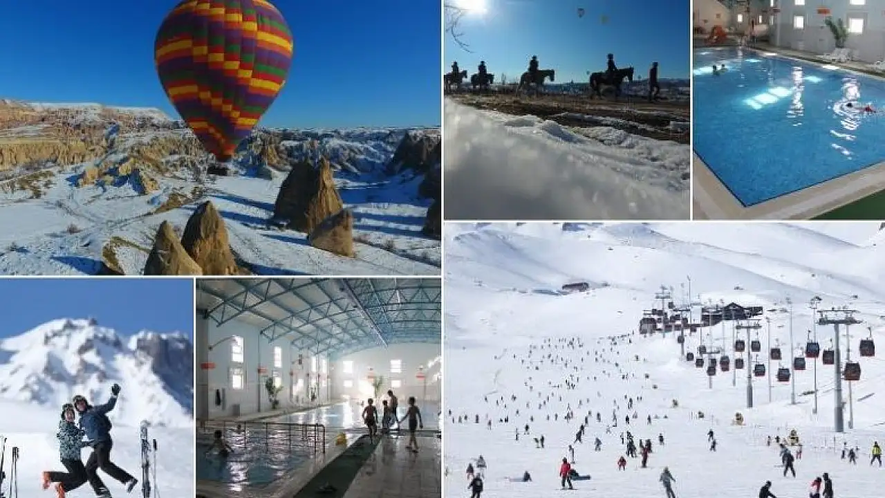 Türkiye'nin gözde turizm merkezi Kapadokya bölgesi, misafirlerine bir günde hem peribacalarıyla kaplı yörede balon turu hem Erciyes Dağı'nda kayak hem de Kozaklı'da kaplıca keyfi fırsatı sunuyor.