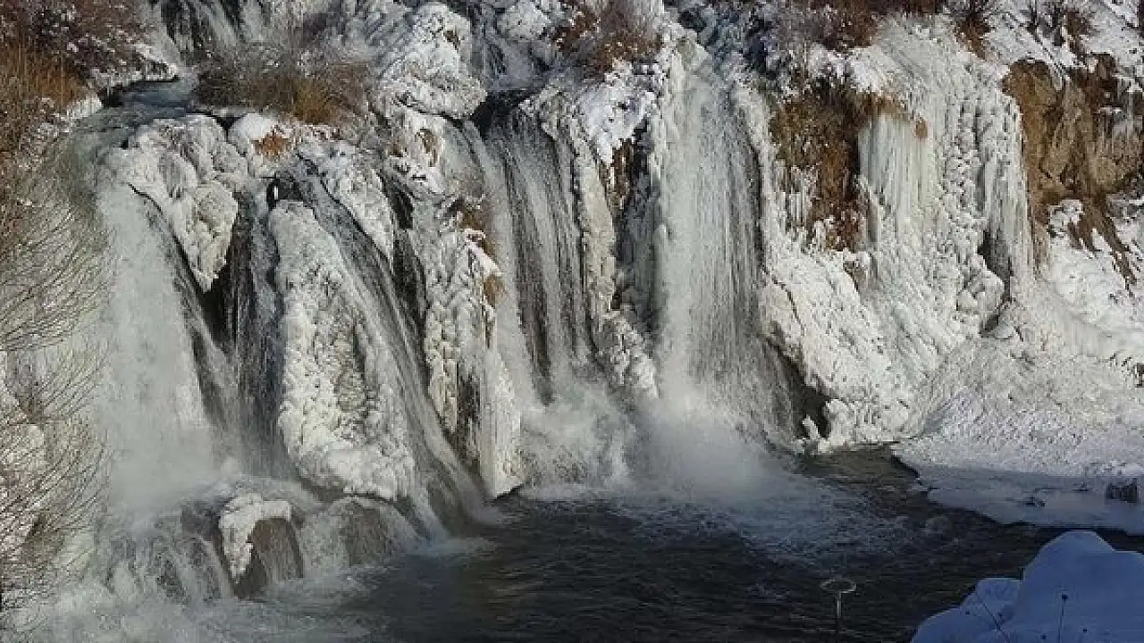 Hava sıcaklığının sıfırın altında 18 dereceye kadar düştüğü ilçede Bendimahi Çayı üzerindeki şelalenin bir kısmı buzla kaplandı.