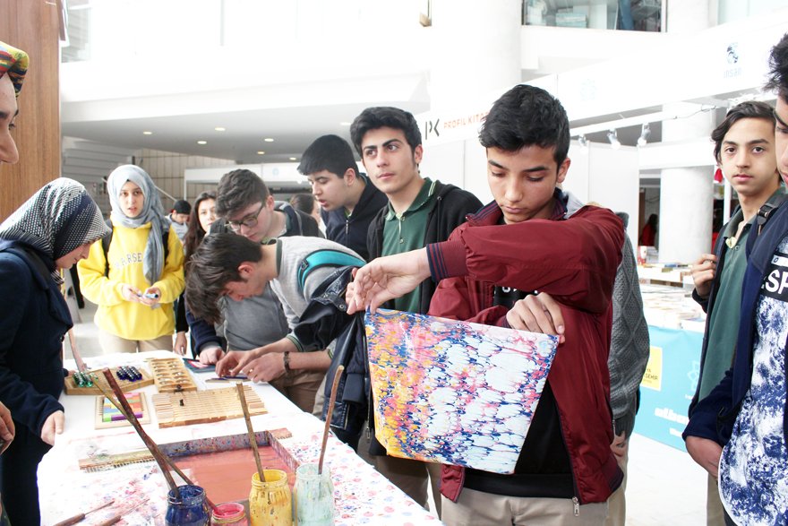 Çocukların kitap fuarında gezerken farklı etkinliklerle de buluşmalarını sağladıklarını ifade eden Seyit Ali Eser; “Fuarda standa gelen öğrencilerimiz ebru sanatını uygulamalı olarak görebiliyorlar. Kendileri deniyorlar. Merak ettikleri bir sanatı, genelde televizyonda gördükleri bir çalışmayı burada birebir kendileri uyguluyorlar. Yaptıkları ebruyu da kendilerine hediye ediyoruz. Birçoğunun hayatlarında ilk yaptıkları ebru oluyor. Daha sonra zekâ oyunlarından bir demet oluşturduk. Dünya üzerinden en fazla kullanılan ve ön planda olan 8 farklı zekâ oyunumuz var. Bunları deniyorlar, nasıl oynandığını görüyorlar.” ifadelerini kullandı.