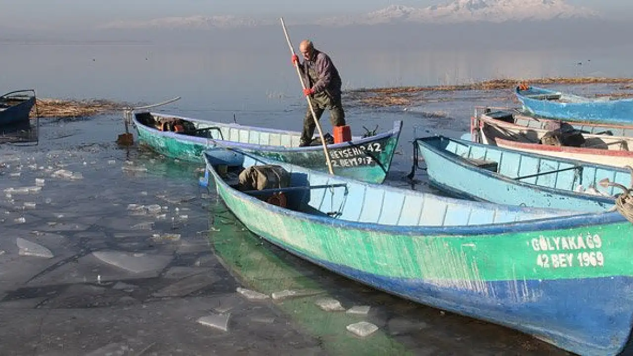 Kıyıları donan Beyşehir Gölü'nde balıkçıların zorlu mesaisi