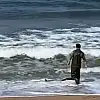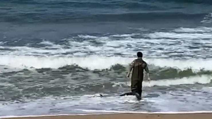 BARTIN'ın Kurucaşile ilçesinde Hüseyin Fırtına, sahile vuran yunusu kuyruğundan tutup denize sürükleyerek kurtardı.