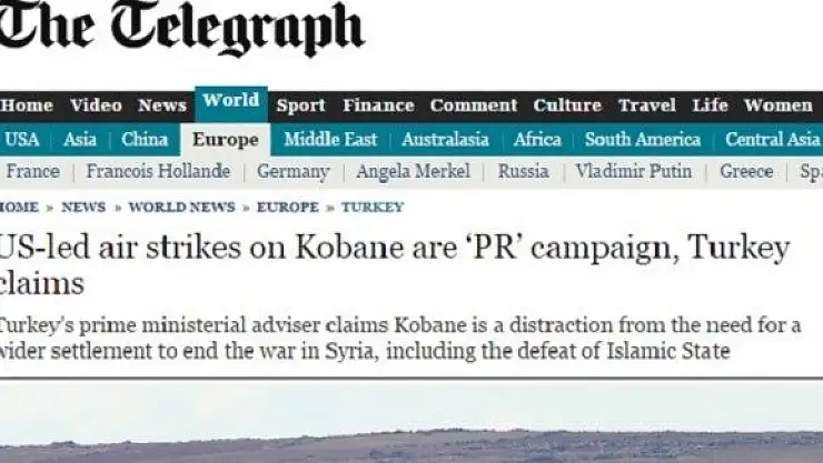 Başbakan Ahmet Davutoğlu'nun danışmanlarından Cemalettin Haşimi İngiliz Daily Telegraph gazetesine gündeme ilişkin açıklamalarda bulundu. Haşimi, ABD öncülüğündeki koalisyon güçlerinin, IŞİD'i oyaladığını belirterek, "Biz Kobani'de olan bitenler konusunda çok endişeleniyoruz. Ancak bu teröre karşı verilen mücadele bir şekilde halkla ilişkiler kampanyasına dönüştürüldü" dedi.