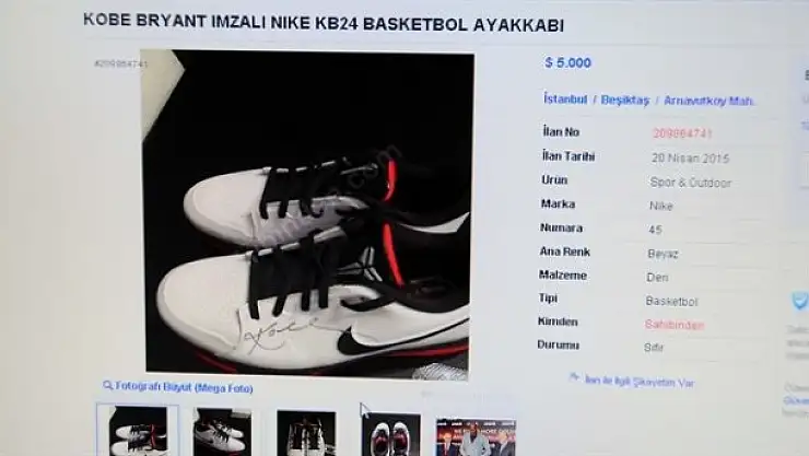 Sahibinden satışa çıkartılan Kobe Bryantın THY reklam çekimleri öncesi imzaladığı ayakkabı internet üzerinden satış yapan bir sitede alıcısını bekliyor. 5 bin dolara satışa çıkartılan ayakkabı için ilan detayında THY'ye özel reklam çekimi için İstanbula gelen Kobe Bryantın 1 adet özel getirdiği ve resimde göründüğü gibi imzaladığı ayakkabıdır denildi.